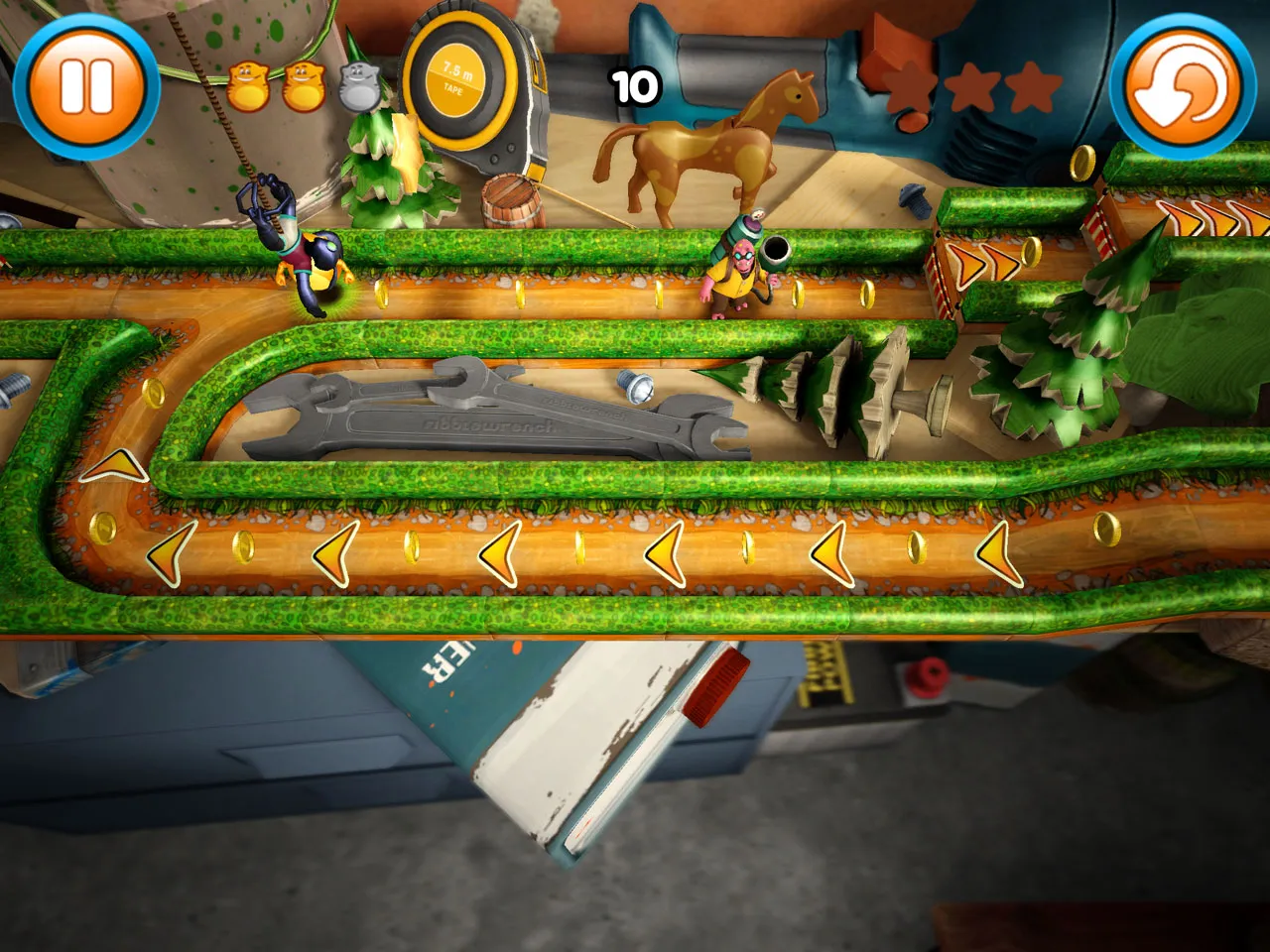 Fibble teams up with assorted aliens as players flick the little critter through a series of puzzling courses. You plot Fibble’s trajectory by touching the iPhone/iPad screen and dragging your finger in the opposite direction, winding up the critter for a big roll. The spherical Fibble then relies on momentum and several expertly placed speed boosts to hurtle him towards the goal, collecting coins and stars along the way. When Fibble runs out of steam, players can tilt their device to nudge him in the right direction. The basic controls feel intuitive and reliable. If you’ve played any other iPhone games of this ilk, you’ll definitely come into Fibble with the necessary skills to make it to the end.