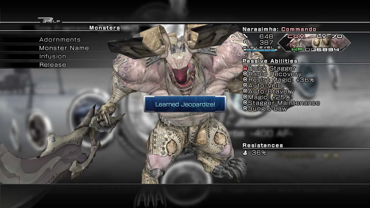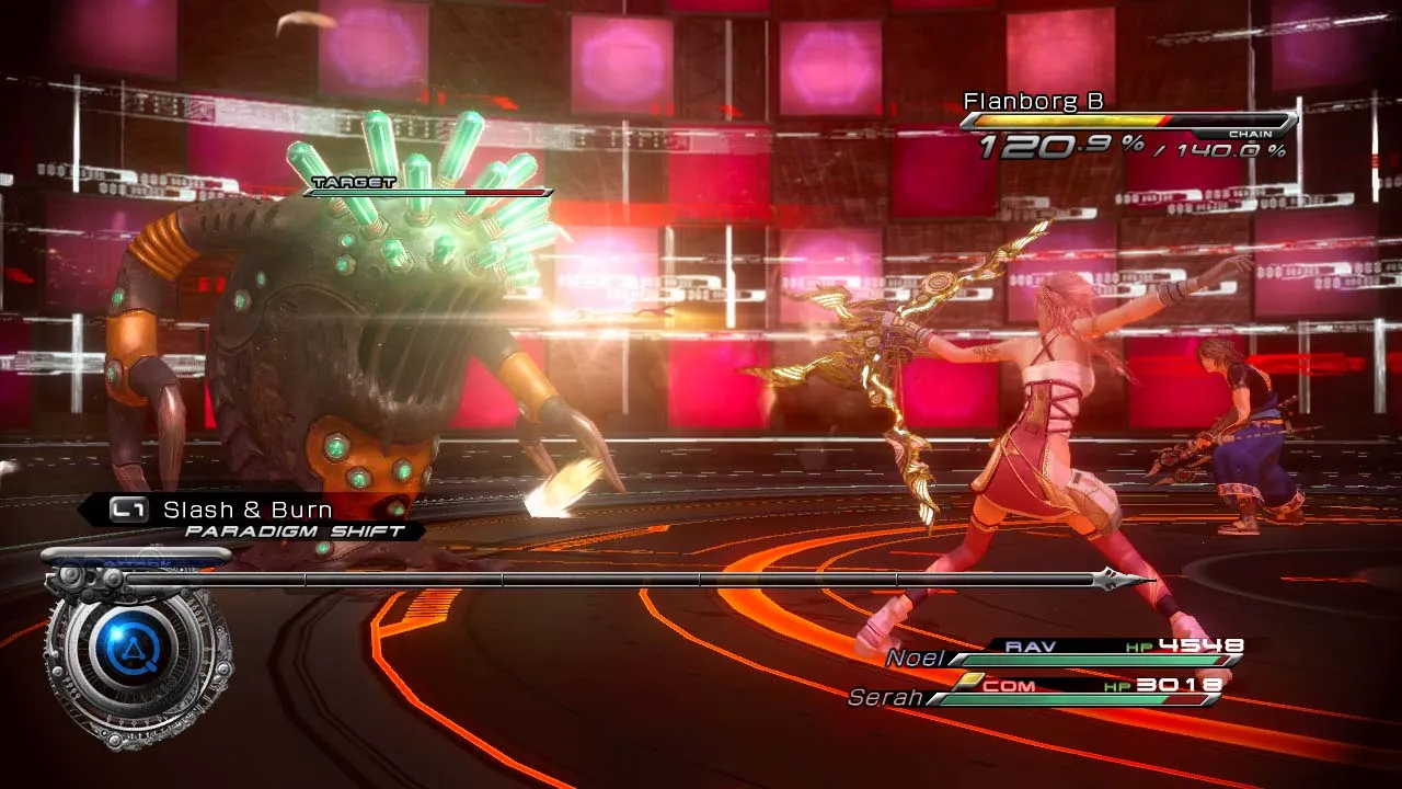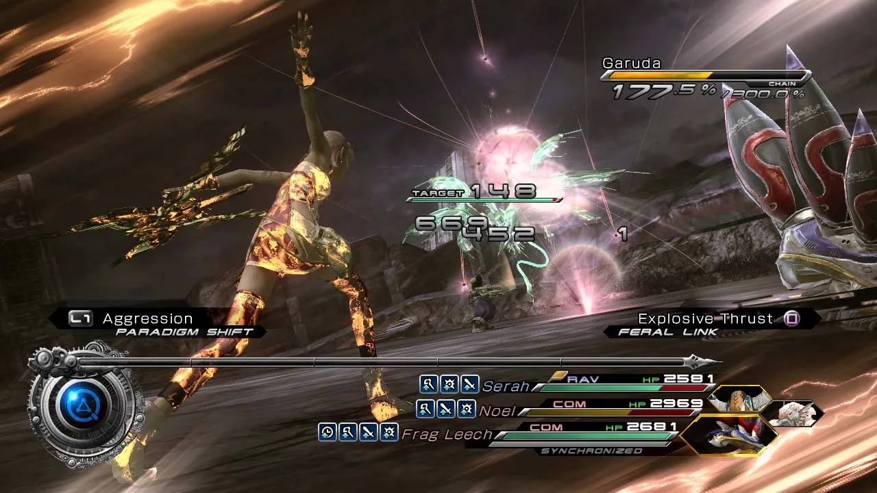 The biggest addition to battle is monster collection, which isn’t just an optional side-activity. You’ll always have Noel and Serah in your party, and the third slot is occupied by a monster that you’ve caught by defeating (no Pokéballs necessary). Each monster has a role that you can level up and use to build your paradigms. For instance, Feral Behemoths are commandos, Blue Chocobos are ravagers, and Cait Siths are medics. You need to consider these roles along with Serah’s and Noel’s aptitudes when forming your paradigms. This adds a level of customization and versatility that you didn’t have with your party before. Plus, finally obtaining a powerful monster that you’ve been hunting delivers an extremely satisfying thrill.