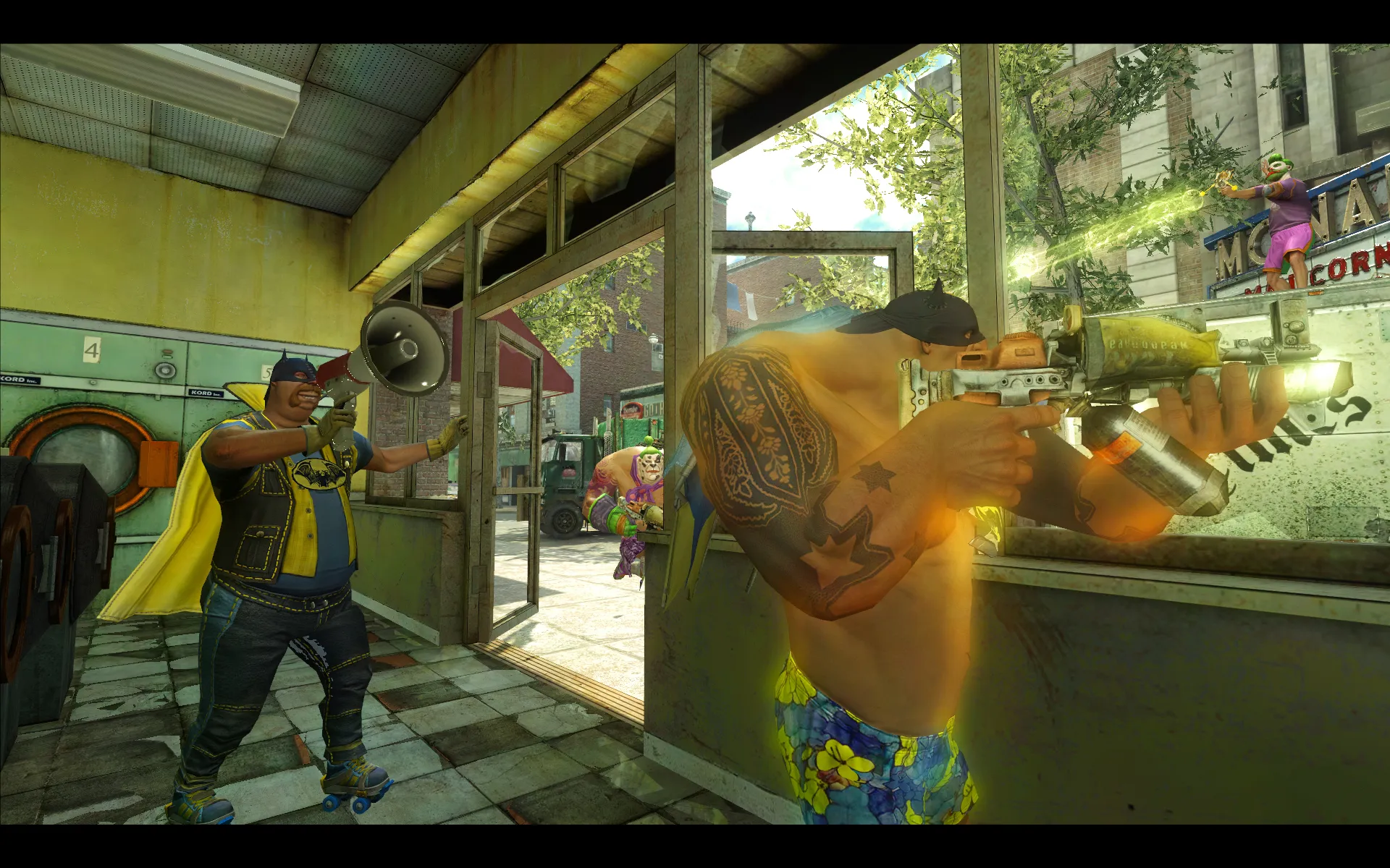 Mobility in many modern shooters is limited to jumping, sprinting, crouching, and going prone. Gotham City Impostors adds a comic-book sensibility to the action by giving players access to grappling hooks, spring boots, roller skates, glider rigs, double-jumps, and more. You won’t have to worry about looking for a staircase or ladder to change your elevation, as a nearby trampoline or well-placed grappling hook shot will help you get around the map with ease. If you have the glider rig equipped, it’s a blast to fly into the air (via one of the numerous air vents) and swoop down fist-first into an unsuspecting enemy’s face.