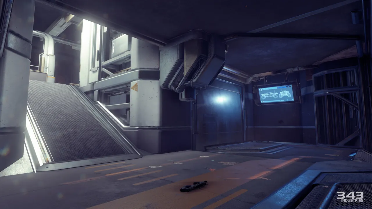 “There’s always been verticality in Halo maps, but this game really harnesses it,” DelHoyo says. “Clamber takes center stage in a lot of cases.” Because 343 didn’t want to hold players’ hands, there are no obvious decals on ledges. Instead, subtle lighting reminds players that they don’t always need to look for a staircase or ramp. Exploration might even be rewarded with small, elevated hiding spots.