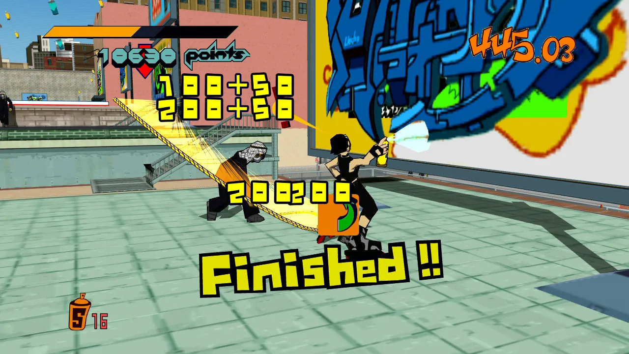 The visuals and the soundtrack remain the highlights of the experience. It’s visually appealing, and the crisp lines look great in high definition. I’ve always liked cel-shading – the technique seems to age well. By placing an emphasis on defined borders on the figures and eschewing complex textures (which would now look ugly), cel-shading evokes that timeless quality that older, sprite-based games have. As for the soundtrack, the forward-looking mix of Japanese pop, dance music, and American hip-hop is as energetic and fun today as it was over a decade ago.