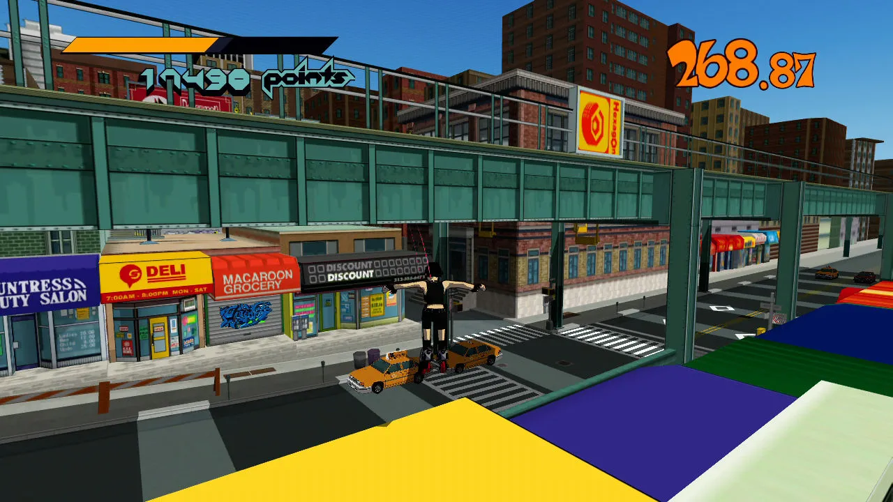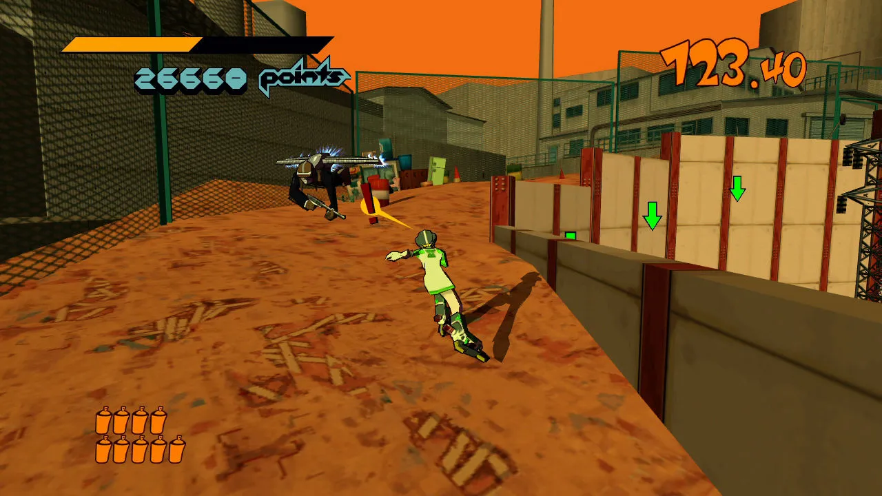 Sadly, Jet Set Radio’s gameplay is archaic and frustrating. Even at the time, the game paled in comparison to the Tony Hawk series. The impressive style, graphics, and sense of fun were enough to blind us. Today, it just feels poorly made. While the premise – explore the environment and tag graffiti spots – is solid, the moment-to-moment gameplay isn’t enjoyable. Your skater controls like a tank on ice skates. This lack of fine control is exacerbated by camera problems and the barely controlled chaos of the rampaging cops and urban traffic. Too often, you fall off a ledge just to be hit and carried off by a bus or run into an off-camera police officer. Grinding on rails is automatic, so you’re magnetically attached to the rail until you choose to jump off, which takes away the feeling daring and creativity that you get from coming up with lines in Tony Hawk. The graffiti tagging, which has you tracing movements with the analog stick, sometimes doesn’t register correctly, leaving you standing there as the police close in. The trick system is shallow and isn’t compelling in its own right.