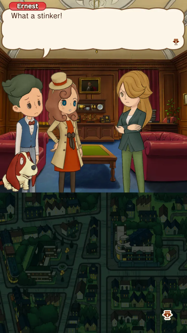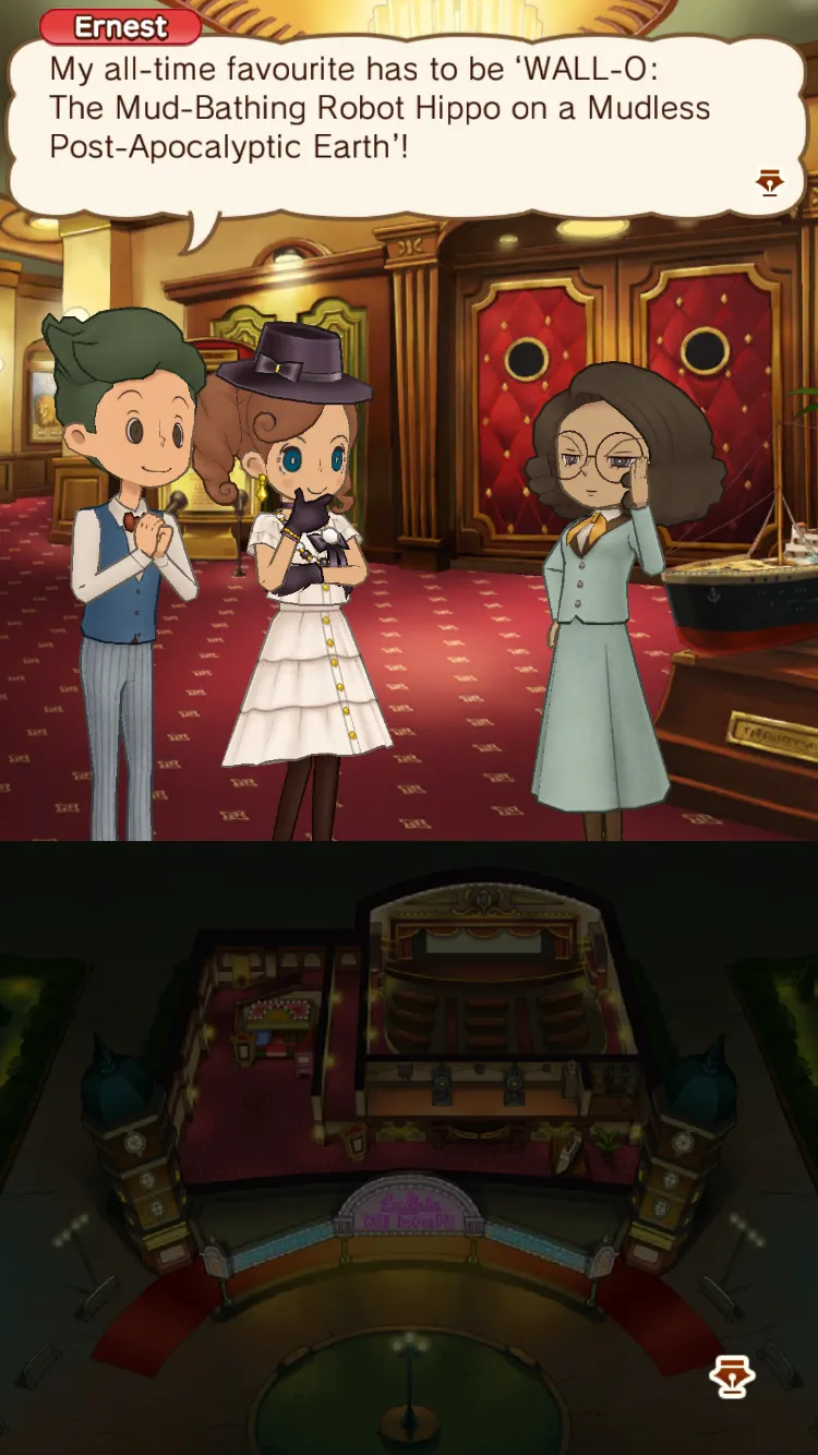 Katrielle is bright, funny, and more interesting than her dad in every way. Admiring Professor Layton’s intellect and poise is easy, but I had much more fun with Katrielle and her joyful approach to puzzle solving (and her seemingly bottomless stomach). Her assistant, Ernest Greeves, has a secret crush on her, and it is not surprising in the least. Katrielle is a highlight, but her story is over-long and doesn’t offer much incentive to see it through.
