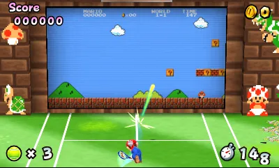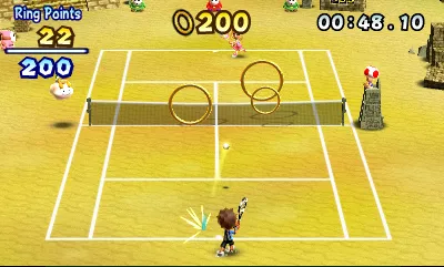 The expected minigames return, though there are not as many as in Power Tennis. Galaxy Rally (where you must rally with your opponent to hit a certain number of returns), Ink Showdown (where the giant squid ball machines will obscure your view with ink blobs), and Ring Shot are fairly standard stuff. However, the Super Mario Tennis mode is ingenious. The original Super Mario Bros. is displayed on the backboard, and it scrolls as you hit coins, blocks, and enemies with the ball. You can even hit warp pipes to travel up and down to hidden areas and aim at the flagpole to end the level. It’s just another example of Nintendo’s endlessly inventive method of recycling its past.