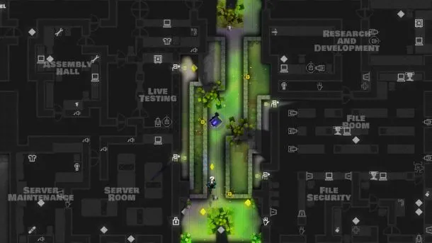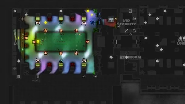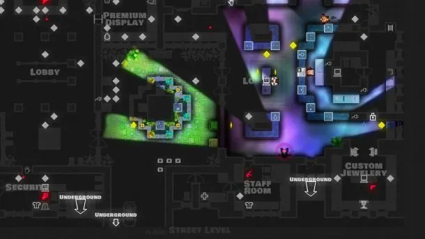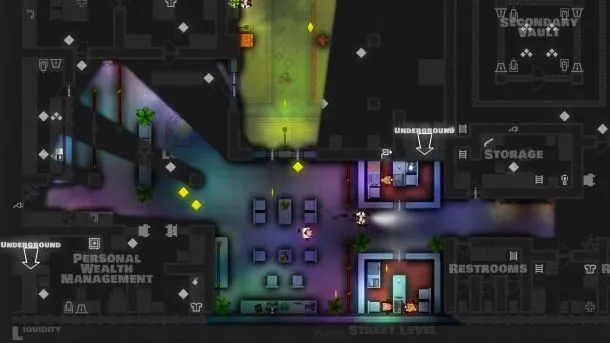 Played from a top-down perspective, Monaco starts out with a gameplay style reminiscent of Pac-Man. Shining gold diamonds are scattered around the level, and sending your character scampering about to pick them up is easy. Outrunning the guards, who trundle after you in pursuit, is just as simple. The floors of each building are darkened until you turn to enter them. At that point, a cone of light reveals what your character can see, blocking off views around corners or darkened underground passageways. Levels pass quickly as you clean them out and continue on your merry way. Decrypting the art style can be tricky early on, but the more you play, the more you grasp what individual objects look like on screen.