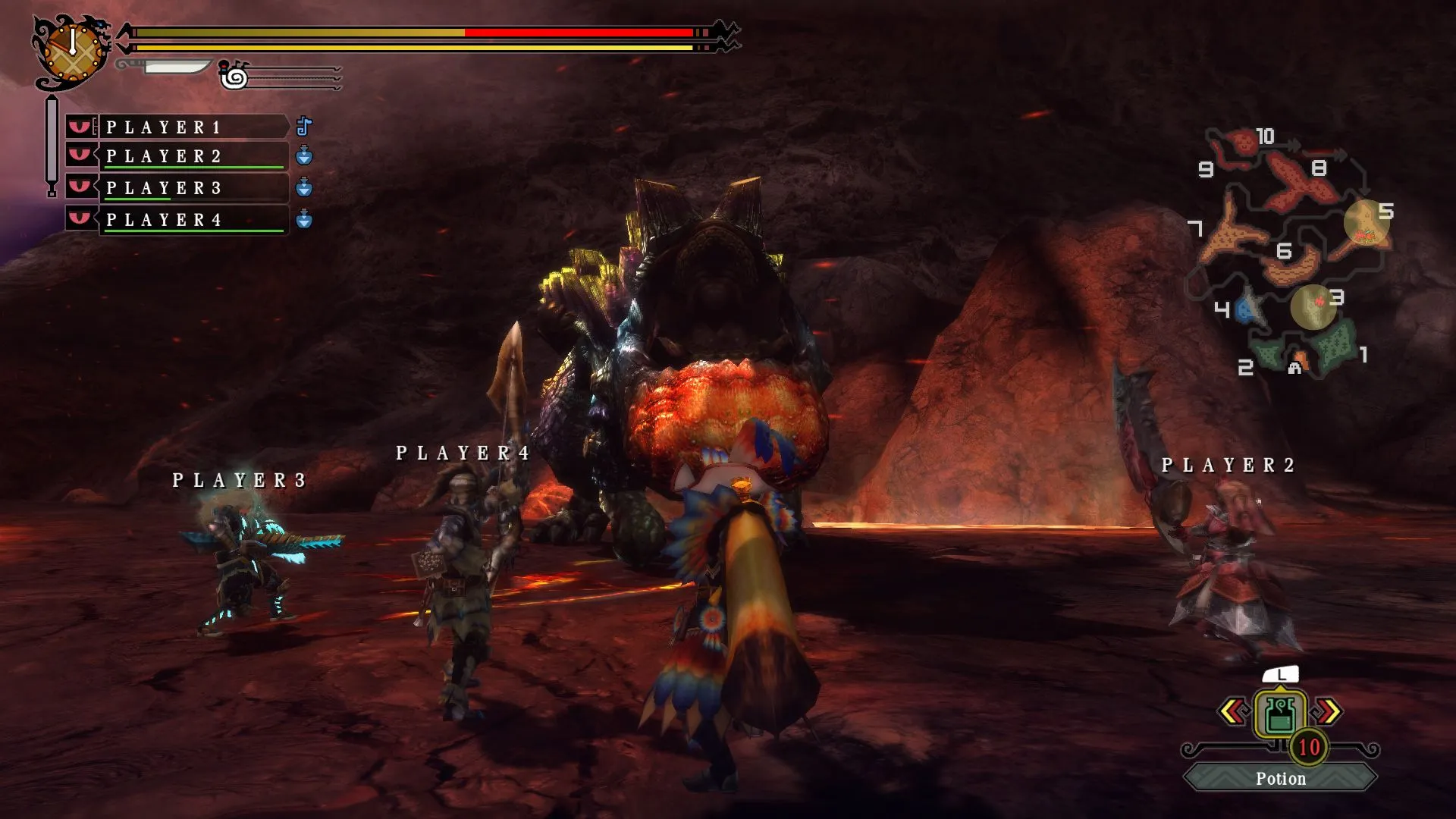 My fellow 3DS-wielding adventurer and I eventually meet up at the quest bulletin board. He’s posted a mission, which I accept. We’re hunting a gigantic dragon across the wiles. Venturing forth into the next zone, we immediately stumble upon a gigantic red dragon. The beast spits fireballs, flails its massive tail, and flies around the environment when we engage it in battle. A new targeting feature allows me to keep the camera fixed on the creature as it soars out of view (especially useful on the 3DS). My ally and I lay gigantic bear traps and sinkhole hazards to impede the creature. We focus our attacks on the tail, eventually severing the appendage and negating one of its attacks. The dragon begins limping and drooling, indicating that it’s fighting spirit is waning. The dragon sulks off to another zone, and we take the opportunity to cut some scales off its severed tail, which may be useful for crafting later.
