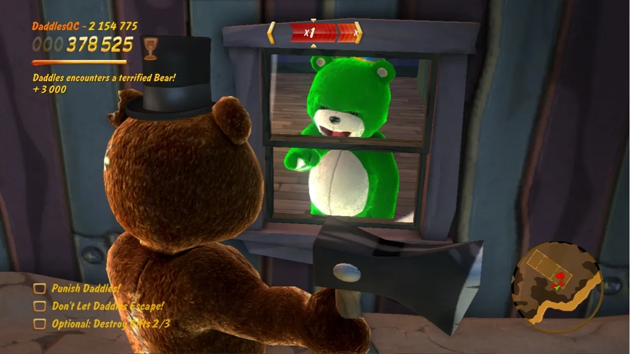 Naughty Bear takes place on an island inhabited by anthropomorphic teddy bears. Your job is to torment its inhabitants. Nearly every evil action you perform, from flushing presents down the toilet to smashing windows and threatening other bears with deadly weapons earns you naughty points, which you’ll need to progress.