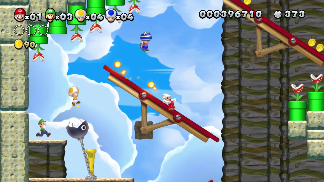 The new twist this time around adds in a fifth player for boost mode. This person watches everything play out on the GamePad screen and can tap to add platforms, stun enemies, and destroy projectiles. It strikes a great balance of luring in players who aren’t confident in their platforming skills while still giving them a satisfying job to do. After some practice, a skilled boost player can rescue the bros from certain doom and help them get hidden star coins. If characters jump on the boost platforms a certain number of times in a row, the boost player can earn a purple star that grants the ability to kill onscreen enemies with a tap. It feels even more empowering than the traditional invincibility speed run. Boost players also have the power to be just as evil as the rest of the onscreen characters (if not more) by blocking jumps with platforms, so they really are included in every way.