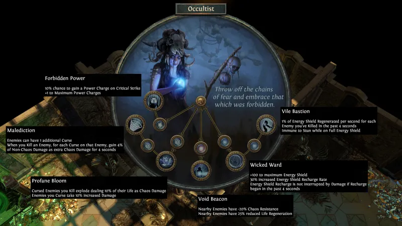 “At face value she’s really good if you want chaos damage, so she’s the obvious choice for people using that set of skills, but she does other interesting things too,” said managing director Chris Wilson. “Because you only choose some of the skills from your ascendancy classes, if you’re not interested in chaos damage then that’s okay. She has other powerful things: Vile Bastion, for example, is something that makes her energy shield a lot more effective since it regenerates as she kills enemies. It’s a completely different playstyle that lets you stay in combat the entire time rather than having to pace yourself. So even if you’re not playing a chaos Occultist, there are still plenty of ways that it augments an existing Witch.”