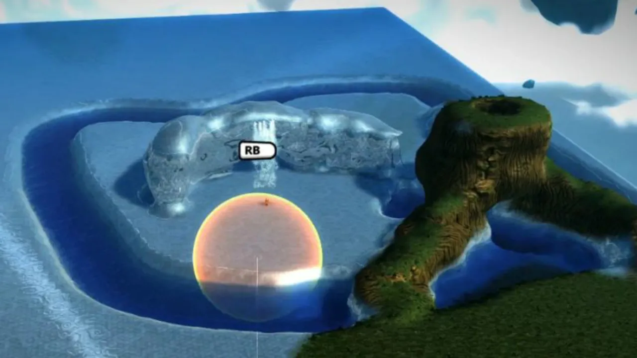 In order to show off the ease of use with a touch screen, the demo is shown using a PC running Windows 8. In this case, a U-shaped landmass is easy to construct because of the intuitiveness of touch screen controls. The demo, however, is shown using a Xbox 360 controller. The silvery mass is created and guided by the orange circular cursor on screen.