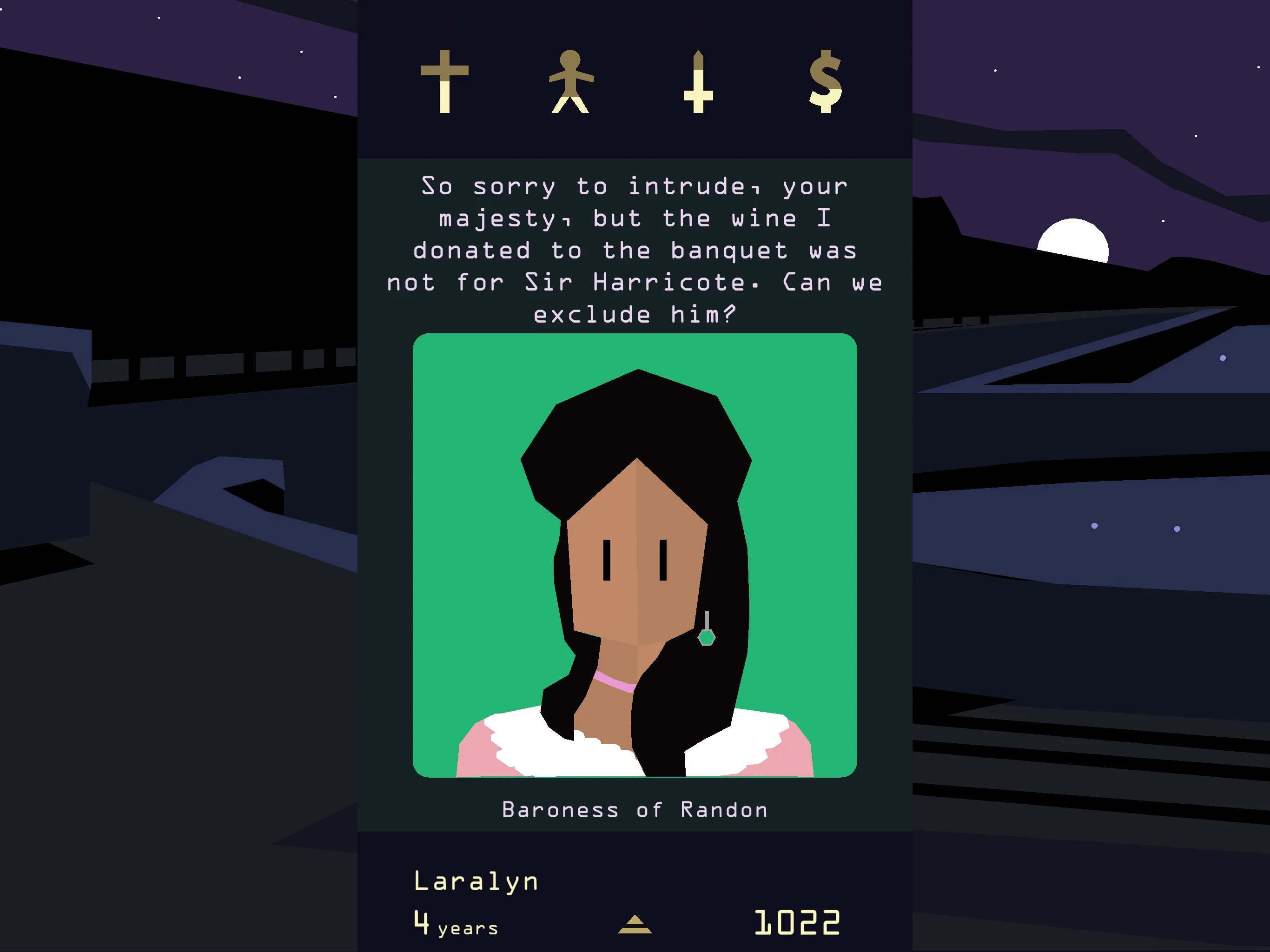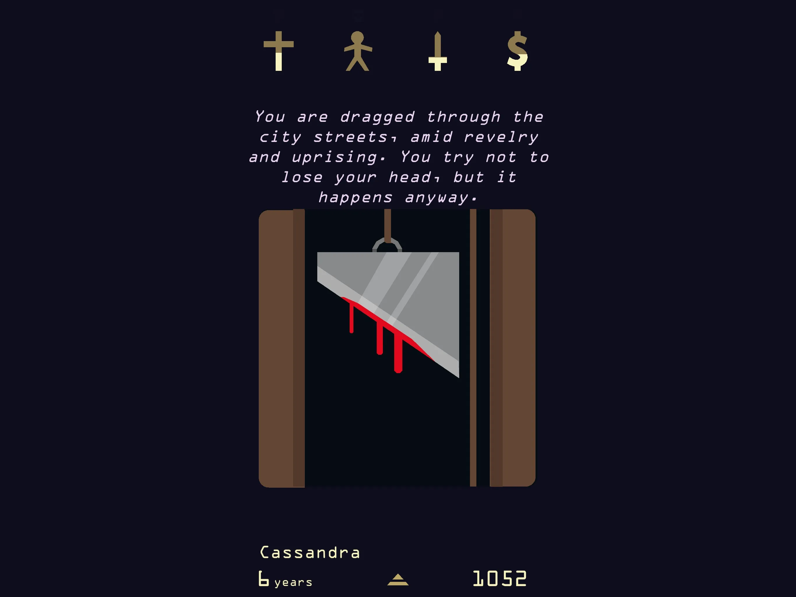 Over the course of your many lives, while trying to maintain balance in your kingdom, you are tasked with completing a series of royal deeds. These achievement-like tasks are often vague, asking you to "host a neighboring kingdom," or "unmask a traitor." Unfortunately, you can't proactively hunt down these quests. Since the entire game is about answering a series of questions, you have to wait until you are presented with most of these opportunities. For example, I couldn't "find a new world" until an explorer came to me and asked if I'd fund his expedition. This passive approach to storytelling often left me feeling helpless as I hurriedly flipped through repeating scenarios until the game finally decided to give me something new.