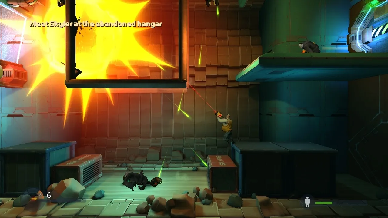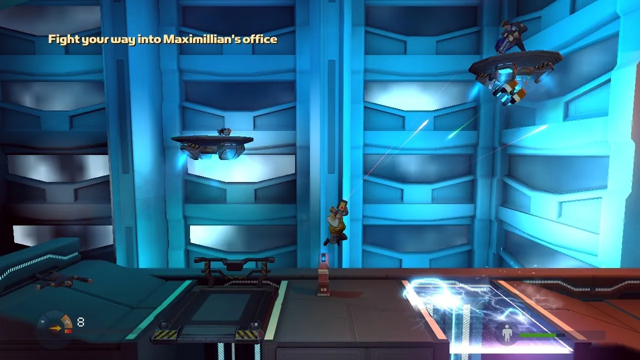 Rochard could be labeled a 2D platformer, but Recoil Games would rather have you solve a puzzle to get to the other side of a room than jump across it. Many of the game’s puzzles task you with navigating past a series of force fields. Some force fields block organic material, while others block inorganic matter or energy, so you might need to place boxes along an organic force floor to jump across it or shoot fuses through inorganic force fields to start generators.