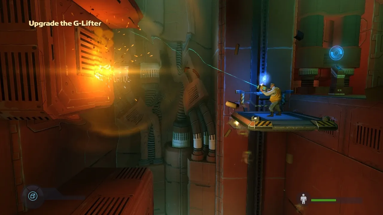 Rochard’s other handy tool is his ability to control the environment’s gravity. At any point in the game, Rochard can turn a rooms gravity down to Moon-like levels. This trick changes Rochard’s approach to puzzle solving in a variety of creative ways. With reduced gravity, not only can Rochard jump higher and survive longer falls, but it extends the firing trajectory of every item he picks up with his G-Lifter, lets Rochard float skyward while standing on air vents, and lets him use the G-Lifter like a grapple hook to swing off bolted objects. I particularly liked jumping through the air in low gravity and then fireing a box downward to give myself a double jump-like boost. Recoil Games shaped a surprising number of puzzles around only a few gameplay elements, and thankfully the mechanics never feel stale.