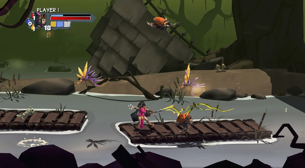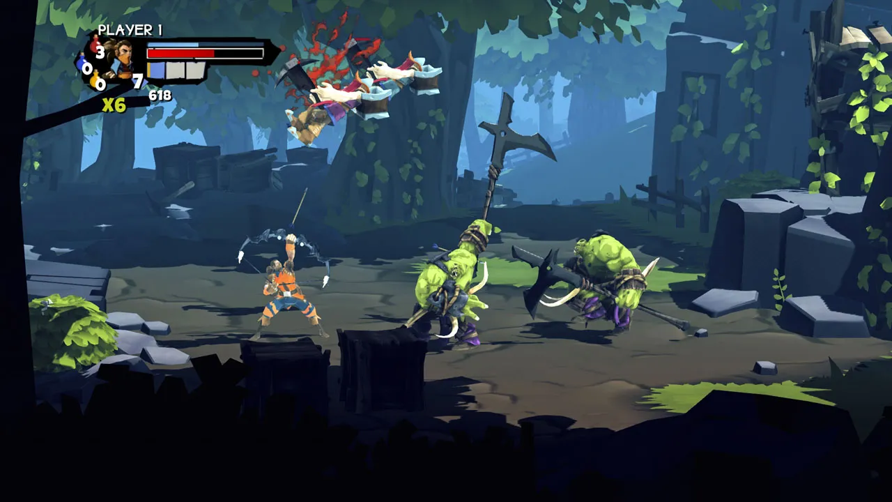 Developer Southend Interactive has created a fluid and versatile combat system. Various enemy types push you to change your strategy, and environmental hazards simultaneously present danger and opportunity. Golden Axe fans will enjoy the variety of powerful mounts and environment-clearing super moves that build up over time. A wide mix of tricky mini-bosses and huge screen-filling menaces rain fire from above.