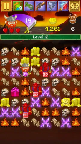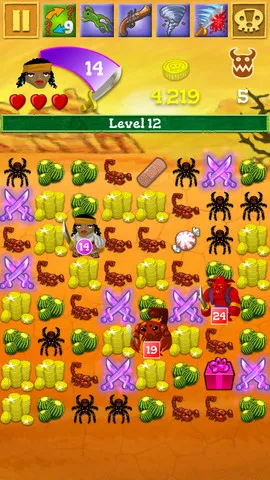 Each isle has several different levels to play, and they can be selected in any order. A few occasional rule changes are scattered throughout them, but the basics are largely the same. Your pirate appears on the board, along with loads of doodads – sabers, bottles of grog, piles of gold, spiders, rats, etc. After a few matches, enemies begin filtering into play. That’s why those sabers are critically important to the game. Every time you match them, your strength increases. To successfully fend off enemy pirates and other monsters, you need to meet or exceed their strength. Fail, and you lose a heart; lose all of hearts and your pirate is dead.