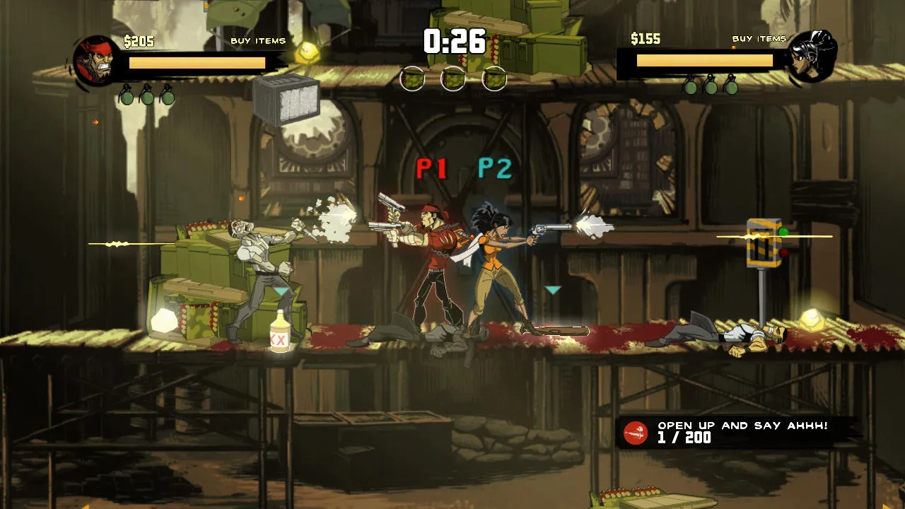 Thankfully, narrative isn’t a concern for Shank 2’s best feature: the wave-based cooperative survival mode. We’ve seen this type of mode pop up in tons of games in the last few years, but it gels nicely with Shank 2’s fast-paced action, allowing you to quickly build up a huge score and money to purchase bonuses between rounds. You can choose between multiple characters with unique buffs and weapons, and each level is peppered with clever traps that help you survive especially brutal rounds. I just wish there were more than three maps to play on.