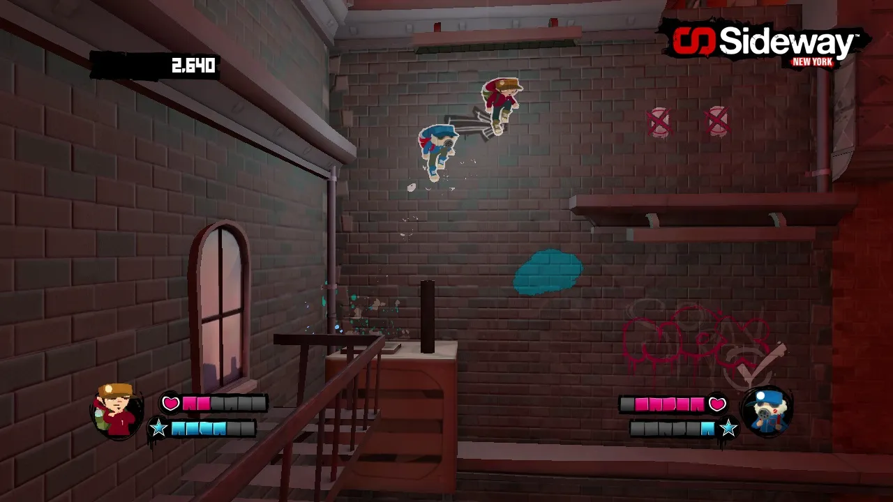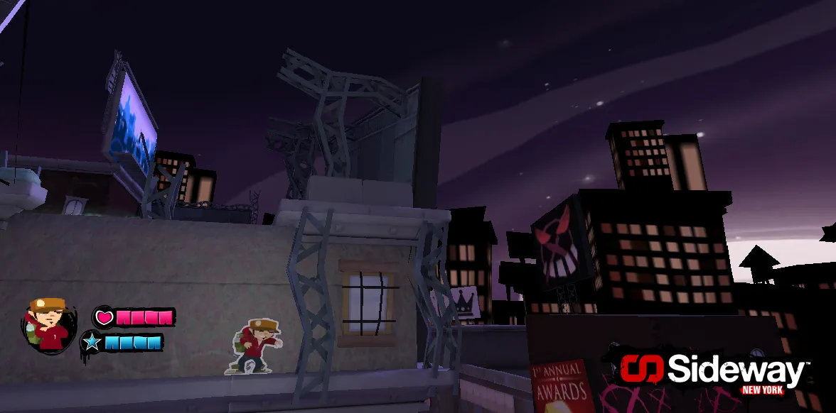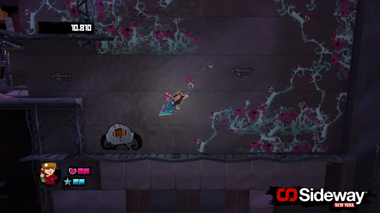 The game itself plays like a 2D platformer, but your character and all the enemies are projected on to the sides of 3D objects and buildings. Nox use window ledges, drain pipes, and other graffiti tags to platform his way though the levels. As he progresses, he’ll slide around the sides of buildings and up onto their roofs.