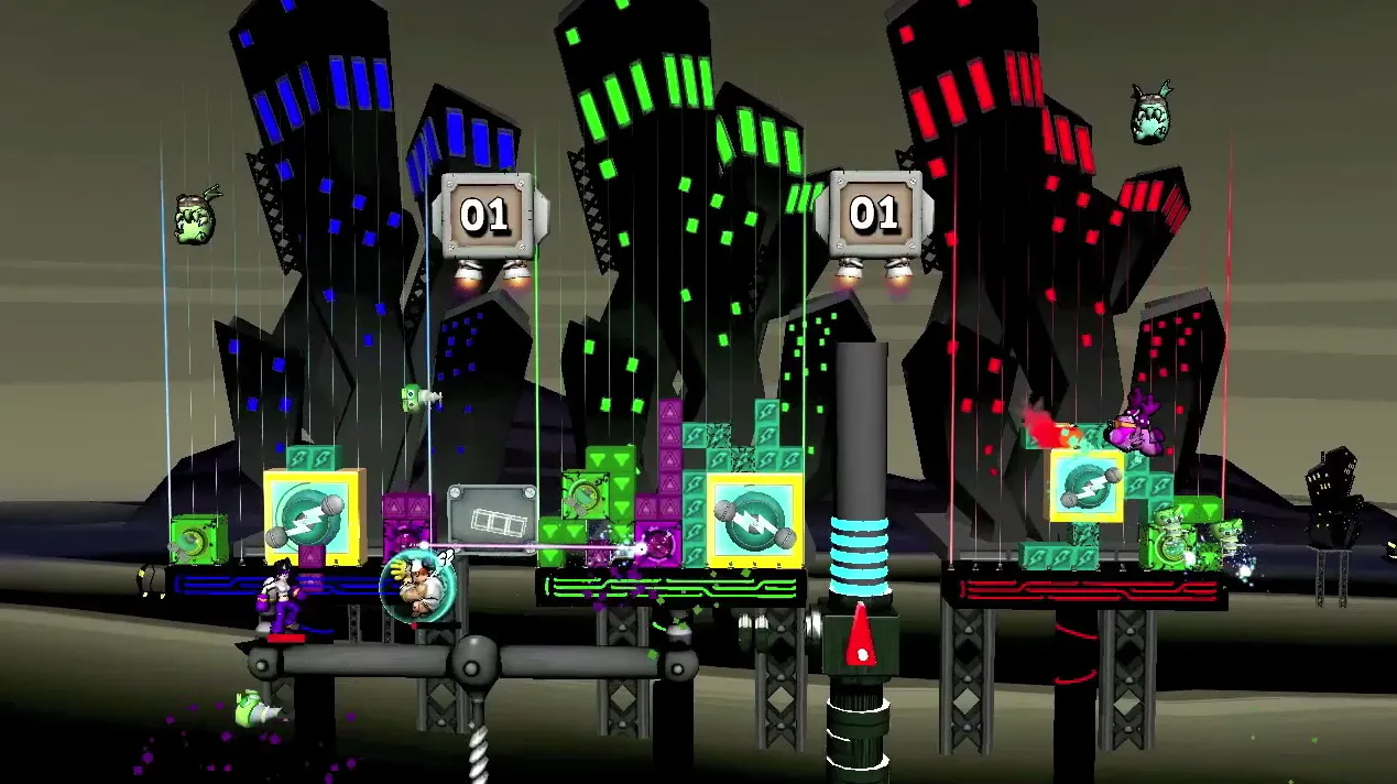 Combat inherently butts heads with tower construction, too, as a particularly aggressive opponent can stunt your progress by causing you to constantly misalign blocks. A transparent block native to the field can be picked up to rearrange your tower, but it’s difficult to capitalize on the feature while in the fray. And the fray is constant. If you are able to exploit the mechanic, however, transplanting a single stray square needed to upgrade a weapon is an immense and rewarding victory.