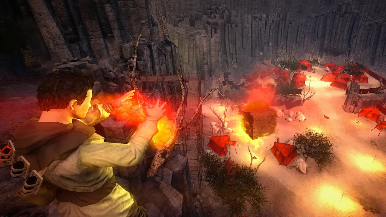 Son of Nor's supported peripherals are what’s most intriguing. The Emotiv EPOC, for example, reads the player's brain activity and translates it into in-game actions. When the device is active, the game progresses the player through a tutorial, teaching them up to three cognitive spells that react to thoughts and facial muscle tensions. Lifting heavy boulders on-screen is achieved by mentally visualizing the command, and a twitch of the eyebrows shoots the rocks into the air. While being a tad finicky and at times hard to believe, when it works it proves to be incredibly engaging.