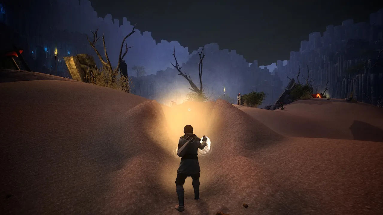 Starting out, players are given two base powers: telekinesis and terraforming. Telekinesis can be used to pick up and hurl enemies across the desert, launch rocks into the air, and create platforms to reach higher areas. Terraforming, on the other hand, has the player manipulating sand by raising it to use as a shield from oncoming attacks, or lowering it to bury enemies alive. Secret passages and hidden collectibles can be found using these abilities, such as digging through sand to discover lost tunnels. These are just a few examples of how abilities can be used, and part of what makes Son of Nor entertaining is discovering these tricks on your own.