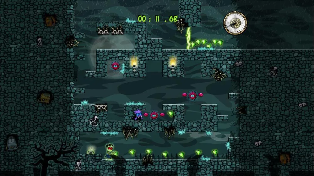 When entering a new room, you never know what to expect. The only constant is that you have to collect all the green gems to clear a stage. Sometimes this just requires making tricky jumps while dodging spiders, spikes, and wasps along the way. Most of the time, however, the tricky platforming is combined with plenty of brain straining.