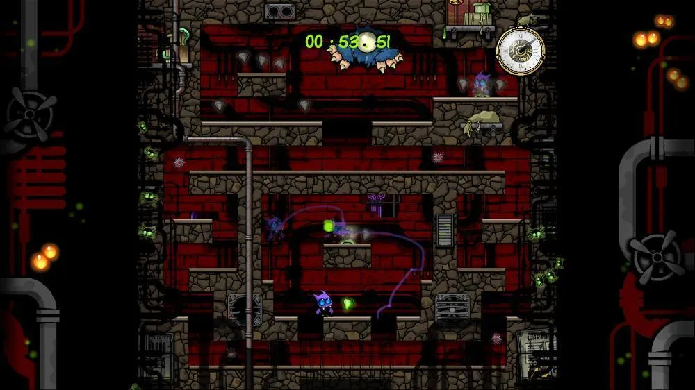 Some rooms give you full control of room rotation, allowing Shuggy to run on walls and ceilings. Other times you must guide little orange creatures to free caged gems, outrun a spike ball chasing you down a corridor, or wind a magic rope around several gears to open the path ahead. In a nod to P.B. Winterbottom, another game type records you and automatically sends out a clone that mimics your movements. The twist? The clones will kill you if you touch them.