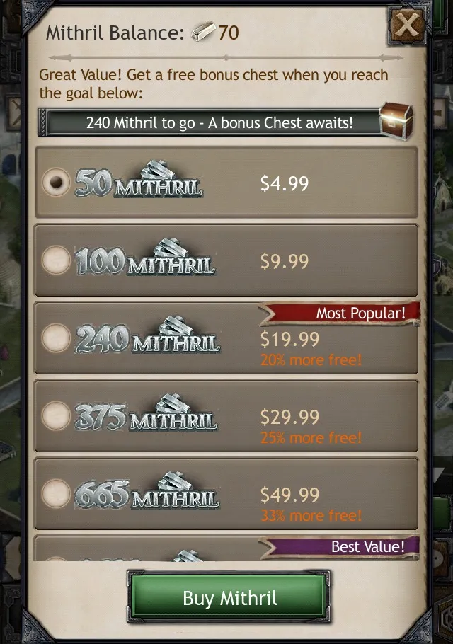 Mithril is the in-game currency that allows you to buy various upgrades and speed up production. Spending real dollars on mithril seems to be avoidable at first, but that changes as the need to defend your city becomes apparent. The pay-to-win ecosystem means that you’re up against other players who are using mithril to augment their production and armies, and you are left underpowered unless you do the same. Unless you want to be constantly pillaged, you need to regularly expend mithril to keep your city and army expanding at an accelerated pace. If you don’t feel like exchanging actual money for mithril, you can count on being on the wrong end of almost every military encounter.