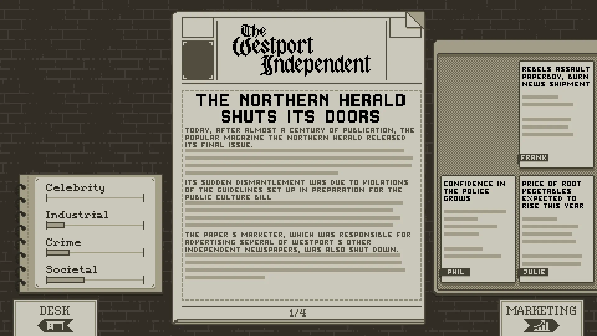That brings me to one of my other problems with The Westport Independent: it operates on extremism. It doesn't have middle ground - reporting events as they happen doesn't get you anywhere, as your paper sales and popularity depend on catering to these rabid groups. Maybe insincere pandering to a specific audience is part of the point, but the game makes you feel like you're this town's last hope for change, making you not want to feed into either group's problematic agenda.