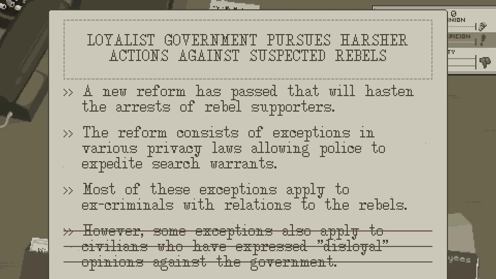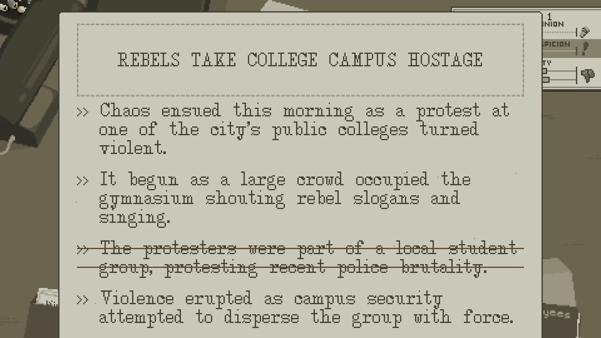 This can be tough, because both sides do some horrible things to get what they want. The Loyalists will look the other way at the police being violent if it ensures less crime, while the Rebels have no issue with ignoring laws and leading dangerous and violent protests. Egging on either of these groups can accelerate their extremism; rebels resort to terrorist attacks, and the police get more corrupt in dealing with dissidents. If you go full-on with catering to the rebels, the government shuts you down, resulting in a game over. Siding with the government only has narrative repercussions, resulting in them increasing censorship and influencing the academic curriculum.