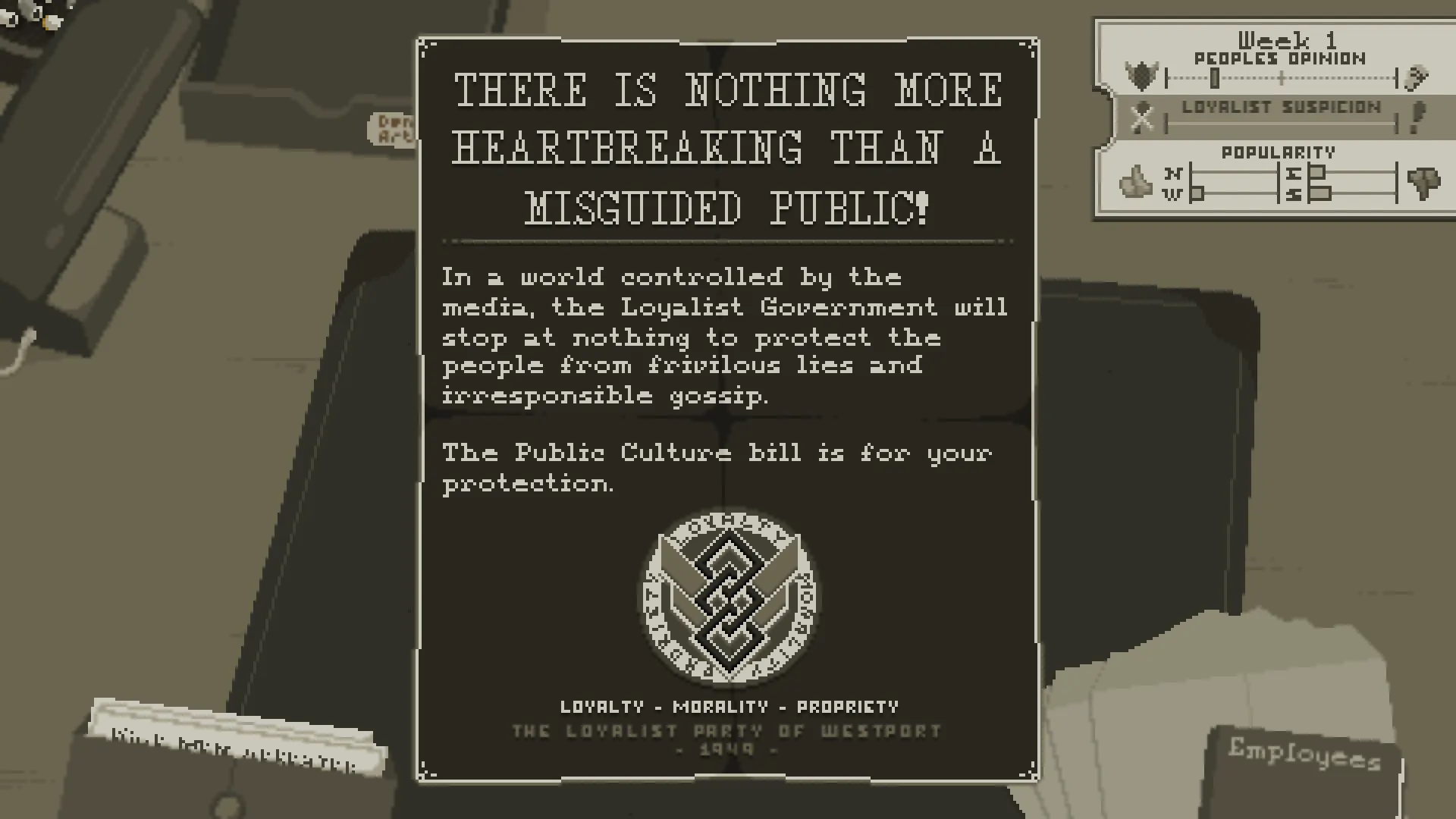 Your staff is also in the crosshairs. Of your four writers, each lands somewhere on the Rebel or Loyalist scale. They may refuse to write certain stories if they represent the opposing side. Assigning the work to the right people is a balancing act, and the government might arrest your employee if the story goes too far, giving you fewer articles to print. At the very least, you learn about your staff's feelings about the articles you print each week in small skits that delve into their personal lives. This is a nice touch, as it humanizes them instead of just making them faceless supporters of one side.