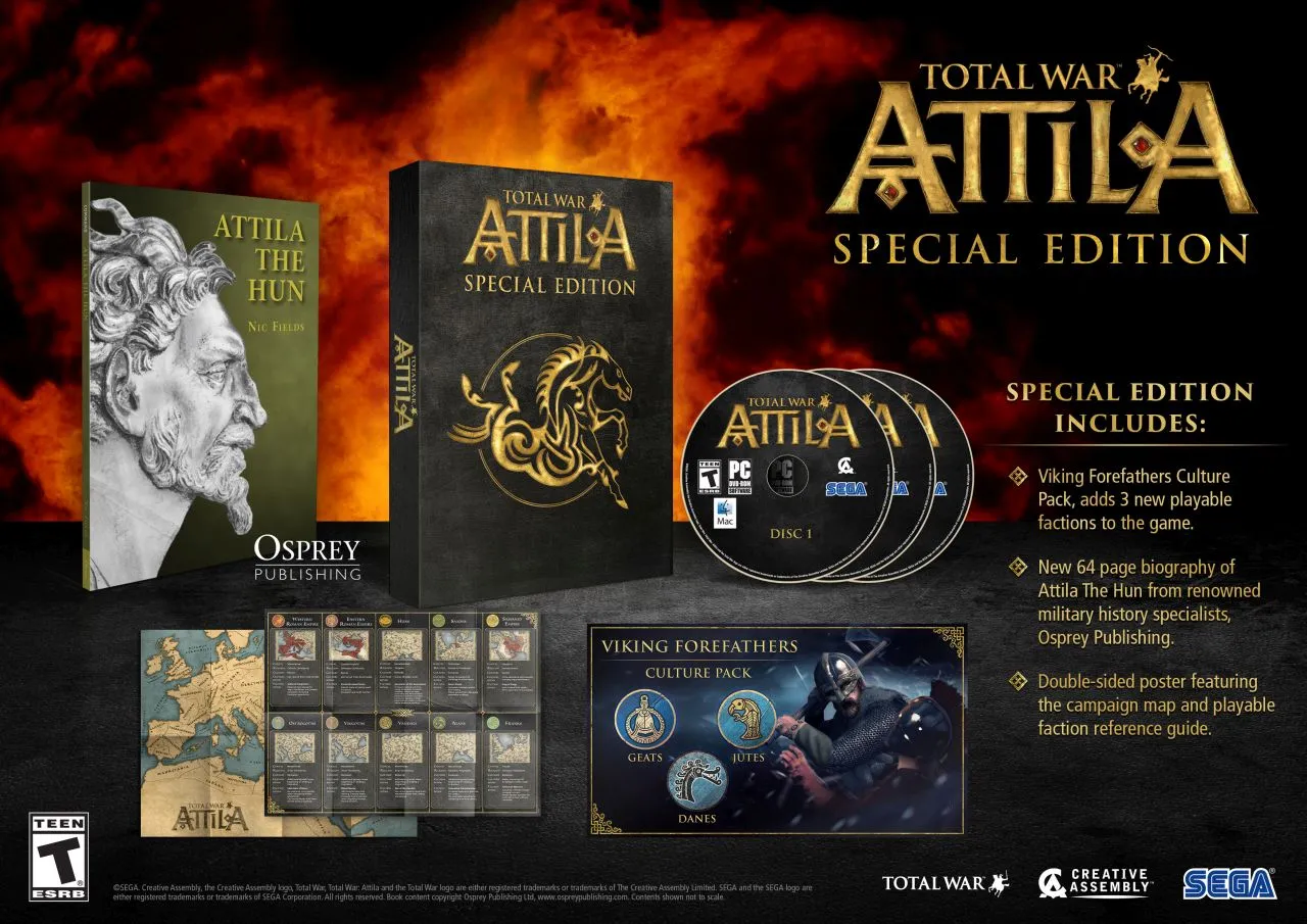 Digital pre-orders of Total War: Attila will include the Viking Forefathers Culture Pack, which adds three playable factions: the Danes, the Jutes, and the Geats. Pre-orders of Total War: Attila’s Special Edition includes a physical copy of the game along with a biography of Attila himself, a reference guide poster with a map and faction references, and the Viking Forefathers Culture Pack.