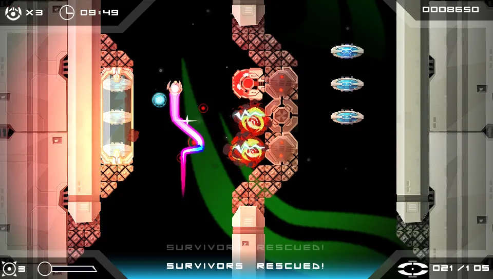 As is typical in vertical scrolling shooters, the screen is constantly moving ahead of the player. The action doesn’t pause or slow down when you use the button to transport, which can be a problem since your ship can’t move while you’re trying to aim your teleporter. The touch-screen method is faster, but requires that you take one of your hands off the controls, which is never a good idea in a shooter. Thankfully, the design of the main levels never place you a in a position where you have to transport repeatedly with speed. My lack of confidence with the teleportation mechanic never caused frustration; it’s not a perfect system, but it’s good enough for what the action demands.