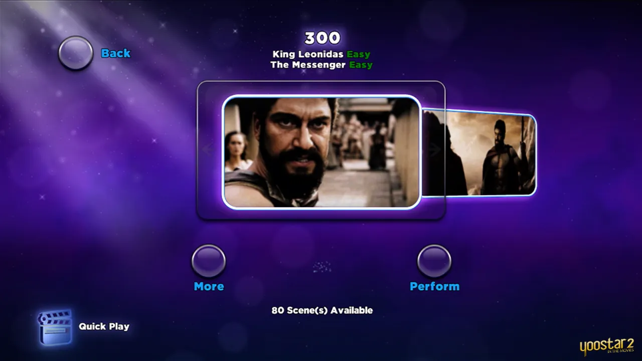 Quick play offers 50 movie scenes for you to perform alone or with friends. The selection is impressive, with a wide range of genres for film and TV fans of any generation. Sing "In The Air Tonight" while throwing down air drums and delivering a punch as Mike Tyson in The Hangover, shout "This is Sparta!" in 300, or "make him an offer he can't refuse" in The Godfather. Watching yourself and a friend in these scenes and delivering lines is hilarious, and the ability to save the clips and upload them to social networking sites is a nice touch. However, even in the ideal Kinect play space you have to awkwardly position yourself to fit perfectly in the film frames, and the grainy picture quality mars your celluloid performances.