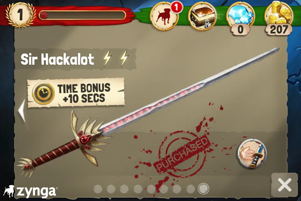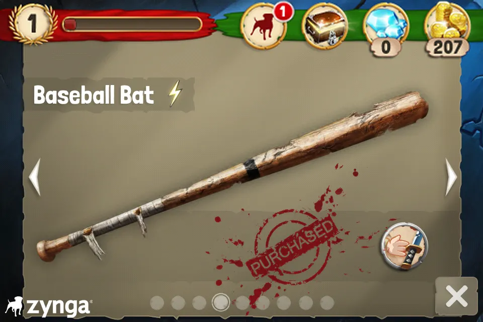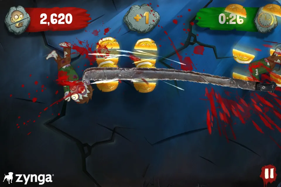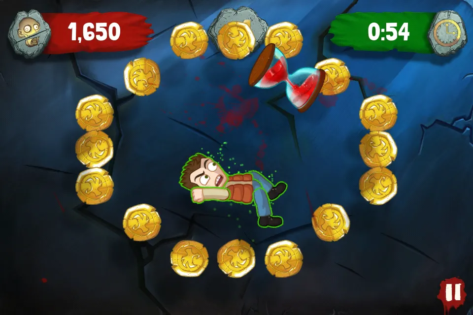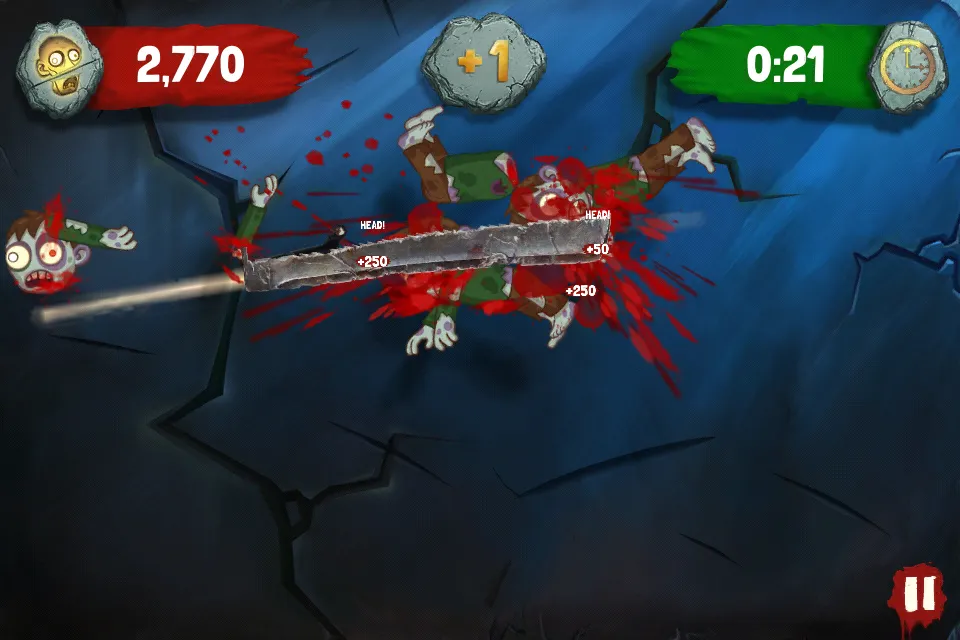 Players have 75 seconds to swipe zombies as they fly through the air, collect coins, and avoid slashing the living. You have access to weapons like swords, machetes, and baseball bats, with fancier and more powerful versions of each unlockable as you progress. Weapons are actually rendered onscreen, so instead of just seeing a colored line swipe through the zombies, you’ll see your weapon slice through the air.