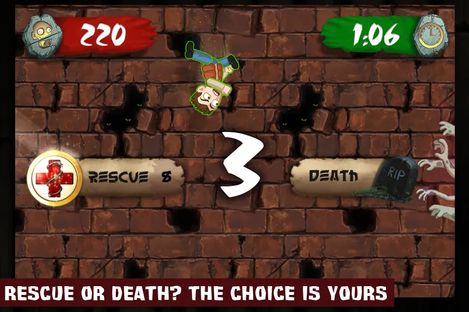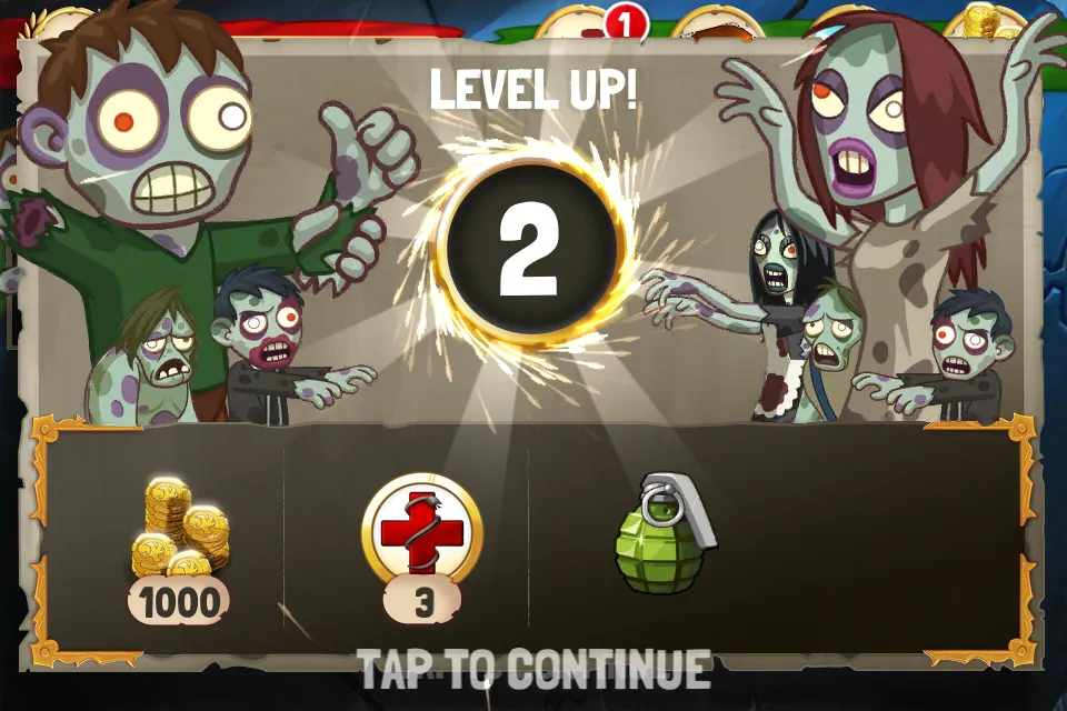 Aside from the clock running out, the game can also be ended by hitting one of the living humans that will randomly pop up. If you hit him, the screen will follow his body as it flies off screen, and you can choose to simply let him die (and turn into a zombie), or you can use a life to rewind time and start from right before you accidentally hit the human. The lives are limited and are earned by leveling up, but can also be purchased with in-game currency. There is no reason to use a life if you don’t think you can beat your high score. It’s better to simply let the man die, and try again.