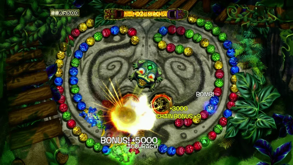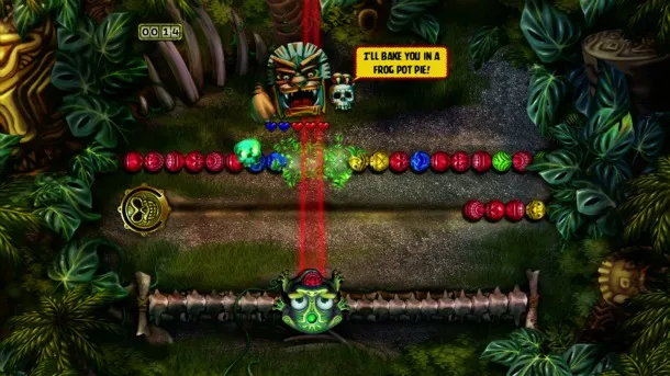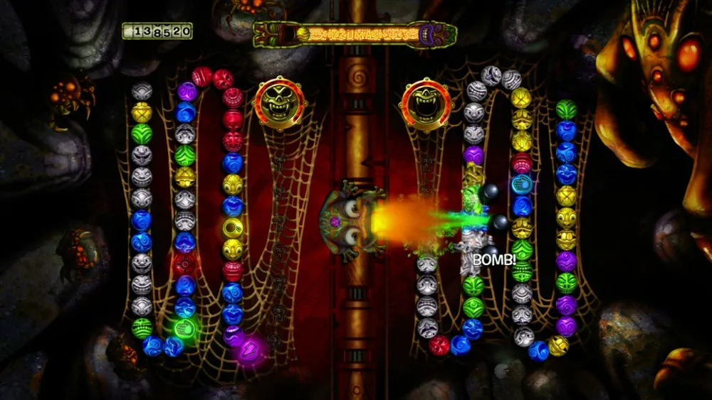 On top of the new progression format, a reduction in difficulty is tied to power-ups. Bombs no longer detonate in the chain. Your frog now earns a bomb shot that can be fired anywhere. If you target power-ups, you’ll end up wielding just as many lethal shot types in a level as an FPS protagonist does weapon types. Way too many marbles are removed by shot augmentations.