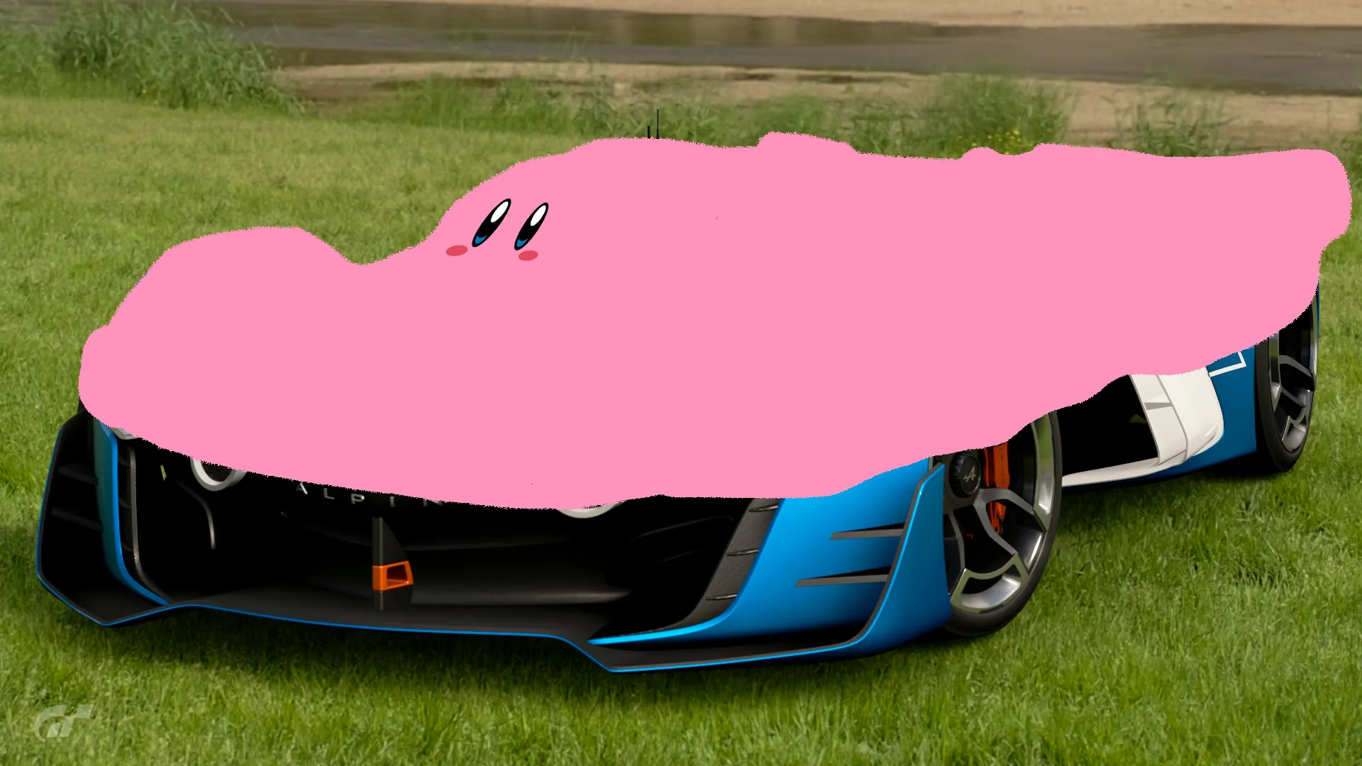 Apparently, this isn't a real car and only exists in the Gran Turismo games. That's fine; believe it or not, Kirby isn't real either. Since the cockpit is offset to the right, I figured Kirby would follow suit by situating his peepers in the corresponding position. I think this makeover proves that if the Alpine Vision is ever manufactured, selling it with a Kirby-themed car covering would cause units to fly off assembly lines.
