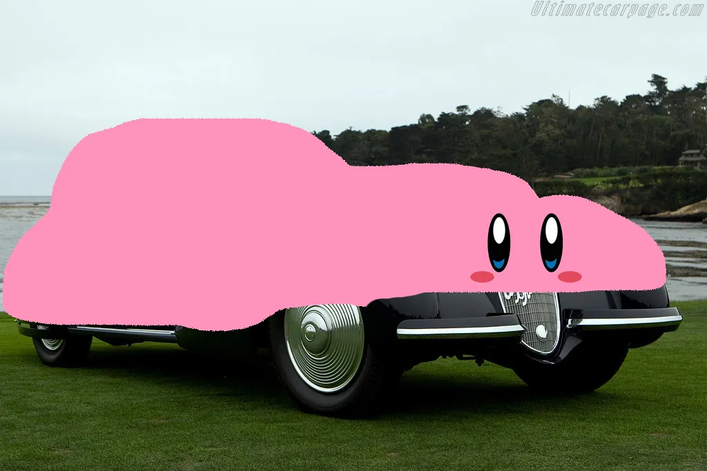 Other than the revelation that "Alfa Romeo" is a great indie wrestler name, I like the classy design of this automobile. Namely, its elongated snout/hood. You'd think Kirby would have a tough time getting that down his gullet but surprise! He manages just fine, and the Alfa Romeo is better because of it.