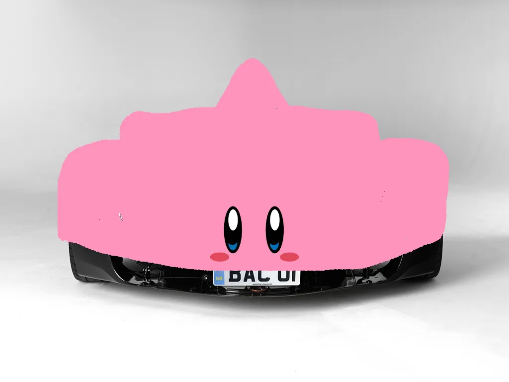 I actually know this car because it was my primary vehicle in Forza Horizon 5. Sorry, I've been told that uttering the "F" word in the same breath as Gran Turismo is highly upsetting to fans for some reason. The BAC Mono has a unique body shape, and it may be the world's most expensive tripping hazard due to how low it is to the road. The way that pointy seat protrudes through Kirby's form looks painful, but I think the marriage is mutually beneficial otherwise.
