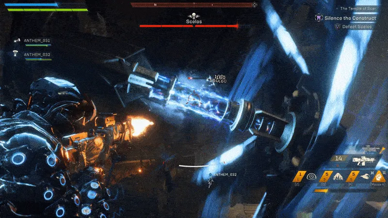The boss of this stronghold, a quadruped Scar war machine called Scelos, was protected by an impenetrable shield maintained by three separate contraptions at the edges of the arena. In order to break the shield, my team had to weave behind the contraptions' rotating propellers and shoot the glowing weak point on the machine’s stem. Once those were destroyed, we had a brief window to deal damage. Each time we had to open him up, the weak point would become more thoroughly protected. It was a fairly standard boss encounter overall, but it was the best time I’ve had playing Anthem yet.