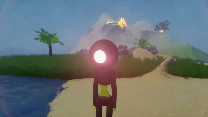 After the fires are planted, I decide to grab an alien-looking fellow (luckily there are a bunch of characters that fit the build in the Dreamiverse) to serve as the protagonist of this little level. I plant him down, enter play mode, and presto: I have a goofy looking island that an alien has crash-landed into. There are no objectives, no bad guys to fight, no goals. It's just a set piece right now but maybe later on I can turn it into a level, using logic gadgets and such. Already I'm wondering about what I want to do with these assets. What game could this be? An adventure? A shooter? A puzzler? What's the goal? Getting off the island? Sending an SOS?