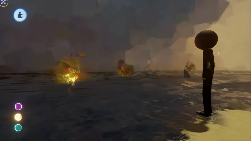Remember what I said about the illusion stuff? After I plant all of the fires, I try to find some wreckage rubble in the Dreamiverse but there's nothing. There is some building rubble, so I grab that, and plant it just beneath the fires in the sea so you can see some kind of rubble but you can't really make out it's bricks and rods. So, basically, the building rubble will work in a jiffy if you can hide it a little bit. So much of creation in Dreams, just like real-world game development, is about smoke and mirrors.