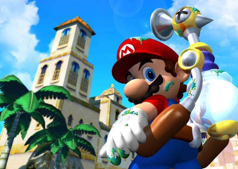 Using the F.L.U.D.D. water pack, Mario cleans up Isle Delfino after a case of mistaken identity. This means much of the gameplay borrows from third-person shooting mechanics in addition to the 3D platforming laid out in Super Mario 64. Because of this, Super Mario Sunshine is a divisive entry among players. Strapping a powerful water gun on Mario was too big of a departure from the core mechanics for some fans. Fans of Super Mario 64 wished for a more conventional Mario experience, a wish that would not be answered by Nintendo on the GameCube.