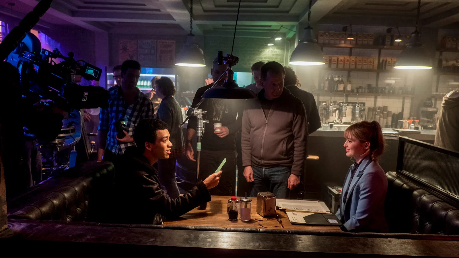 The next stop was a visit to The Roundhouse set. Much of the movie takes place in Ryme City and follows protagonist Tim Goodman, played by Justice Smith, and Pikachu as they work together to uncover the story of Tim’s father, who was supposedly murdered. Ryme City has outlawed Pokémon fighting, but there is at least one sequence that takes place in an underground arena called The Roundhouse. In the movie’s first two trailers, you can see portions of this scene with Pikachu fighting a massive Charizard as a circle of onlookers cheer. The set was densely packed with extras decked out in the kind of clothes you would expect from someone who attends underground Pokémon fights to be wearing. The wardrobe reminded me of Team Skull from Pokémon Sun and Moon, but I didn’t see any specific logos referencing Sun and Moon’s goofy villains. For each take, the movie’s assistant director would call over a loudspeaker for elements like sparks to fall from the ceiling, or smoke to erupt from a separate corner of the set.
