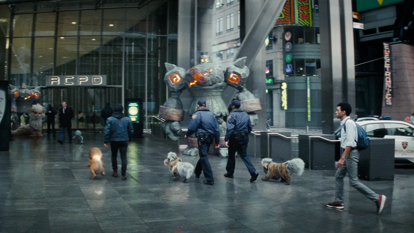 The Pokémon themselves resembled the game series’ sprites, but they had realistic fur, feathers, and scales. Along with the art plastered on the walls, there were also giant cardboard standees featuring familiar Pokémon. I saw early images of Pokémon that would later be prominent in the trailers like Psyduck, Mr. Mime, and Pikachu, but I also saw Aipoms, Loudreds, and a Ludicolo. The film’s visual effects producer, Greg Baxter, says the film will feature at least 60 different Pokémon and every human you see in the film will have a Pokémon with them, even for wide crowd shots. “I don’t know which one is my favorite, but I know which one has caused me the most grief,” Collins says, citing Ludicolo.