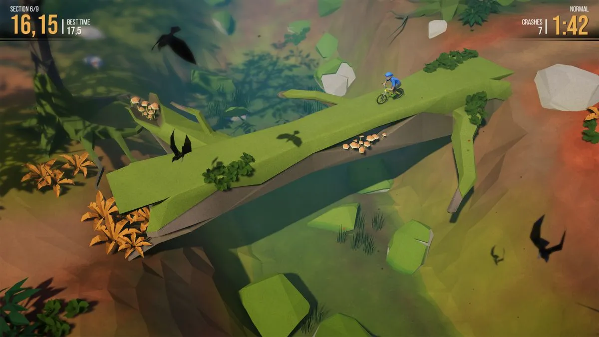 A gentle wind rustles the autumn leaves, and an owl’s solitary call echoes across the mountainside in the pre-dusk light. My bike rattles across an old wooden bridge, and the path ahead curves around the rising roar of the waterfall. Instead of following it, I accelerate off the cliff at ill-advised speed, and crash headlong into a tree trunk, just missing the jump. Time to restart the checkpoint.