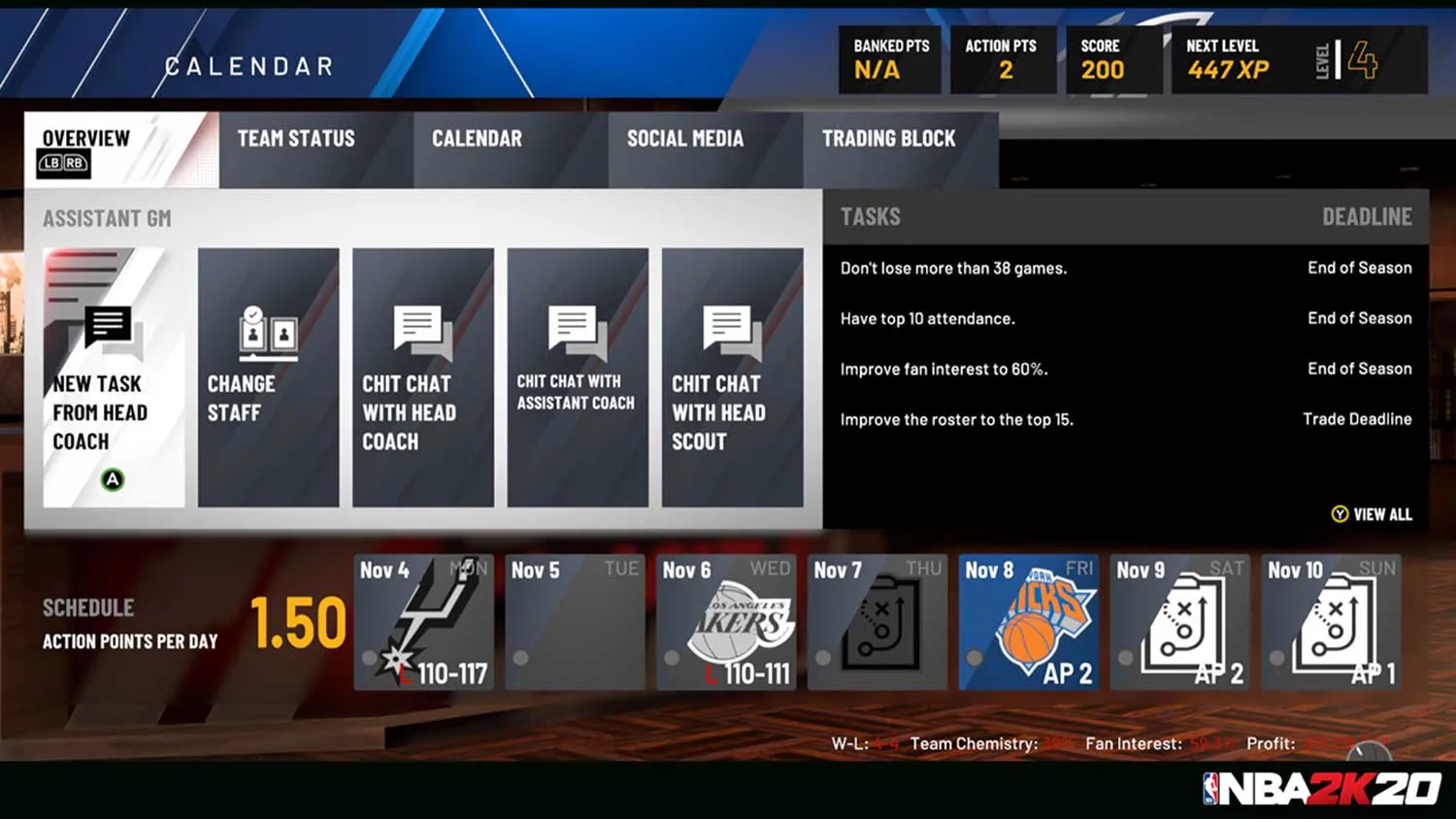 MyGM also surfaces the needs of players via the conversation system, but it drags down the mode. The action-point system driving what you can do in a day isn’t interesting when you have to spend it constantly chit chatting with players to hold inane, repetitive conversations about waffles just to keep up their morale. You also have to constantly fend off their requests for minutes. Unlocking GM abilities like training and scouting is understandable, but I don’t like that it’s tied to objectives that might not make sense like signing lots of veteran players at the behest of the team owner. The actual skill tree itself, which is a part of the entire process, is okay but nothing special.
