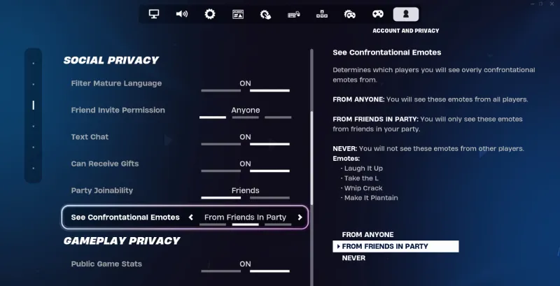 This new setting can be found under "Social Privacy" in the Fortnite settings and it defaults to only show these confrontational emotes from friends in your party. Epic stresses that this setting does not change a player's ability to use any emotes. It is now live in-game.