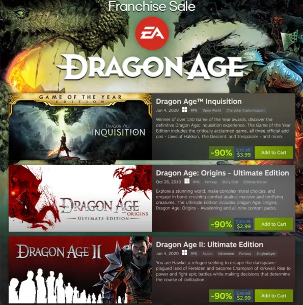 Steam launched a Dragon Age franchise sale yesterday, with a 90% discount on all three games in the series. Here's the prices for each and the order to play them in if you want to start at the beginning: