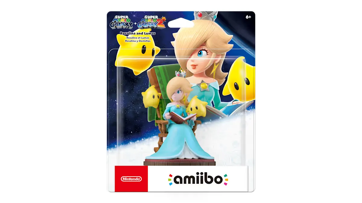 - Description: Rosalina travels through space in a starship called the Comet Observatory. Motherly and protective of the many Lumas that she travels with, she guards the cosmos against any and all threats. Wielding a Star Wand and her signature blue dress, Rosalina always seems cool even in the face of danger. This amiibo figure is larger than standard size, and features Rosalina reading from her storybook with a pair of Lumas by her side.